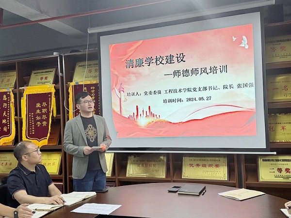 教师是立教之本、兴教之源,而师德师风是评价教师队伍素质的第一标准。为深入贯彻习近平新时代中国特色社会主义思想,以及习近平总书记关于教师队伍建设的重要论述,推动落实新时代教师职业行为十项准则,进一步加强和推进新时代师德师风建设,2024年5月27日,工程技术学院党支部书记、院长张国强在A808会议室开展了清廉学校建设-师德师风专题培训。