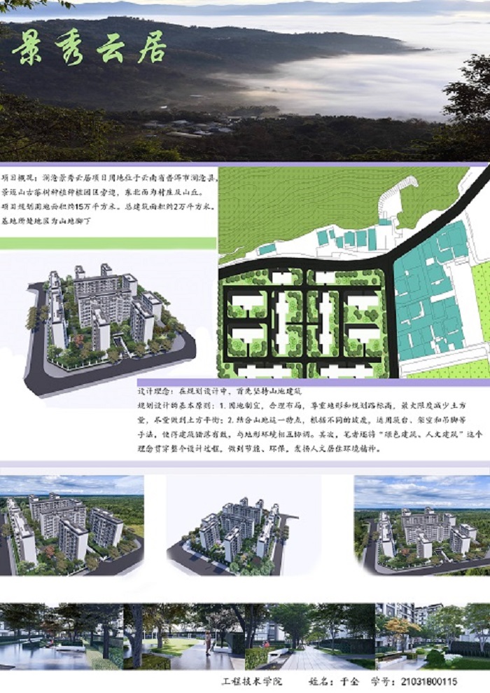 作品描述:该设计以 “景迈山居住区规划设计”为主题,采用“民族特色”系列元素,意欲打造/设计出“以当地独有的山地气候特色的居住区”来满足当地居民的生活需求和对不同文化生活需求的人群、通过联想/开展想象力,充分展示了“景秀云居主题”理念