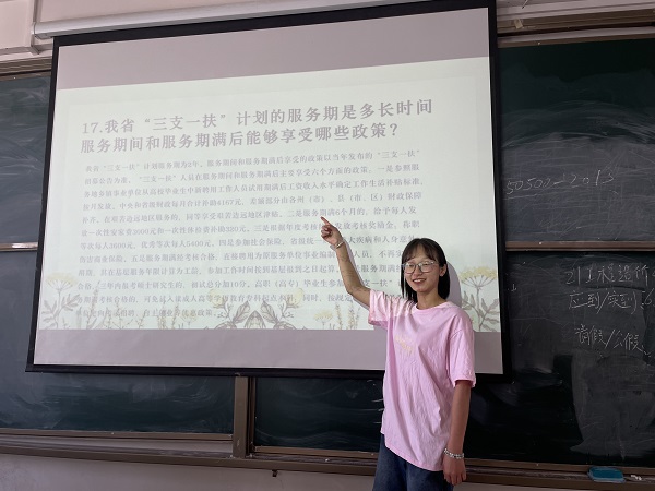 “基层是高校毕业生熟悉当代中国社会、了解中国国情的最好课堂,是高校毕业生成长成才的重要平台。近年来,学校高度重视政策性就业宣传,引导和鼓励毕业生到基层就业创业。