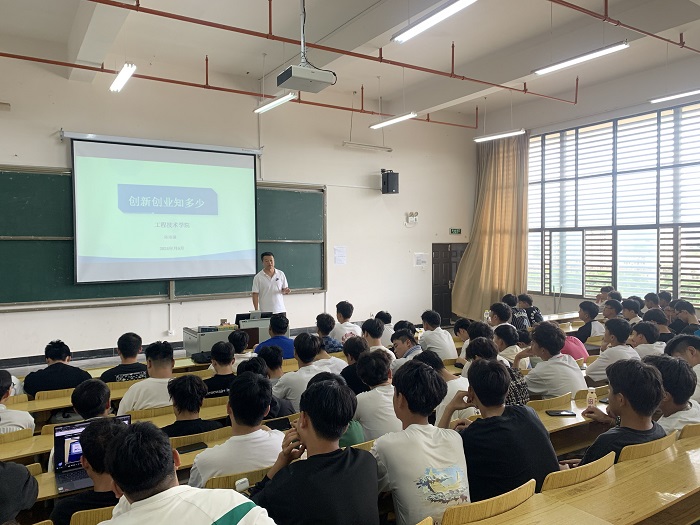为进一步促进“双创”教育的发展,激发和培养工程技术学院学生的创新创业意识,助力同学们高质量就业,工程技术学院于2024年6月13日在阶梯2教室开展“以赛处学,以赛促创—创新创业大赛助力高质量就业”讲座。本次讲座主讲教师为工程技术学院党支部专职组织委员、学生科科长陈海强老师,工程技术学院创新创业指导教师及学生代表参加。