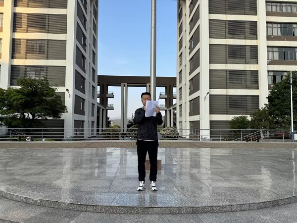 工程技术学院党支部专职组织委员陈海强在国旗下为师生上了一节生动的爱国主义思政课。他以“弘扬求真务实学风,凝聚报国奋进力量”为主题,号召同学们把爱党、爱国、爱人民的情怀转化为思想自觉与行动自觉,矢志不渝听党话、跟党走,在行稳致远中坚定理想信念、在锤炼品格中把稳人生航向、在担当奋斗中淬炼意志品质、在刻苦学习中创造出彩青春,真正成为有理想、敢担当、能吃苦、肯奋斗的新时代好青年。