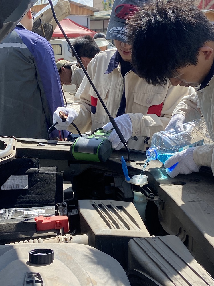 在技术服务区域,师生团队用专业技能为居民排忧解难。他们严格按照操作规范,为新能源汽车提供免费玻璃水补给、胎压检测服务。检测过程中,发现部分车辆存在胎压异常问题,服务人员立即向车主说明情况,并提供调整建议与后续养护指导。针对老年车主对智能导航、语音控制等功能使用不熟练的问题,师生们一对一、手把手教学,切实提升用车便利性。